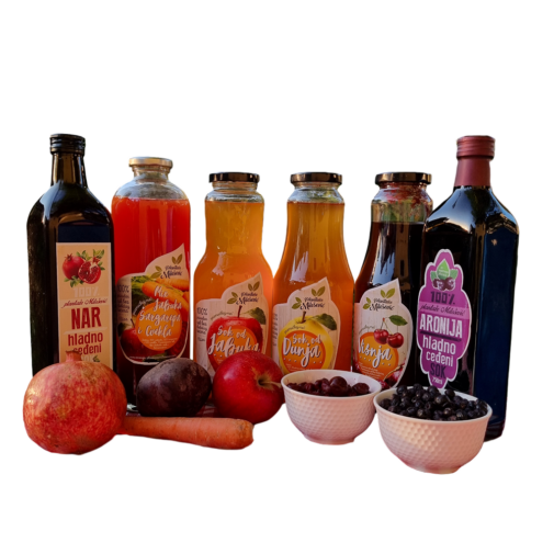 Da naglasimo da su svi proizvodi u našoj ponudi označeni kao “100 % prirodan, hladno ceđen pasterizovan sok”, bez dodatog šećera, vode, konzervansa, boja ili aroma.