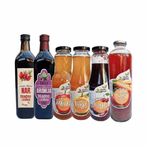 Da naglasimo da su svi proizvodi u našoj ponudi označeni kao “100 % prirodan, hladno ceđen pasterizovan sok”, bez dodatog šećera, vode, konzervansa, boja ili aroma.