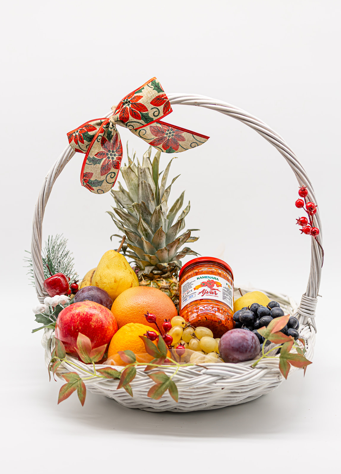 Korpa je od pruća, ručno pletena, a u njoj je spoj pažljivo biranog, svežeg i sočnog voća, poreklom sa domaćih plantaža. U korpi se pakuje ananas, nar, pomorandže, grejpfrut, crno i belo grožđe, kivi, jabuka, kruška, šljiva, banana i drugo voće. U korpi je i ajvar od pečenih paprika, ručno pravljen, bez konzervansa, veštačkih boja i aditiva, pogodan za zimske dane i dane posta.