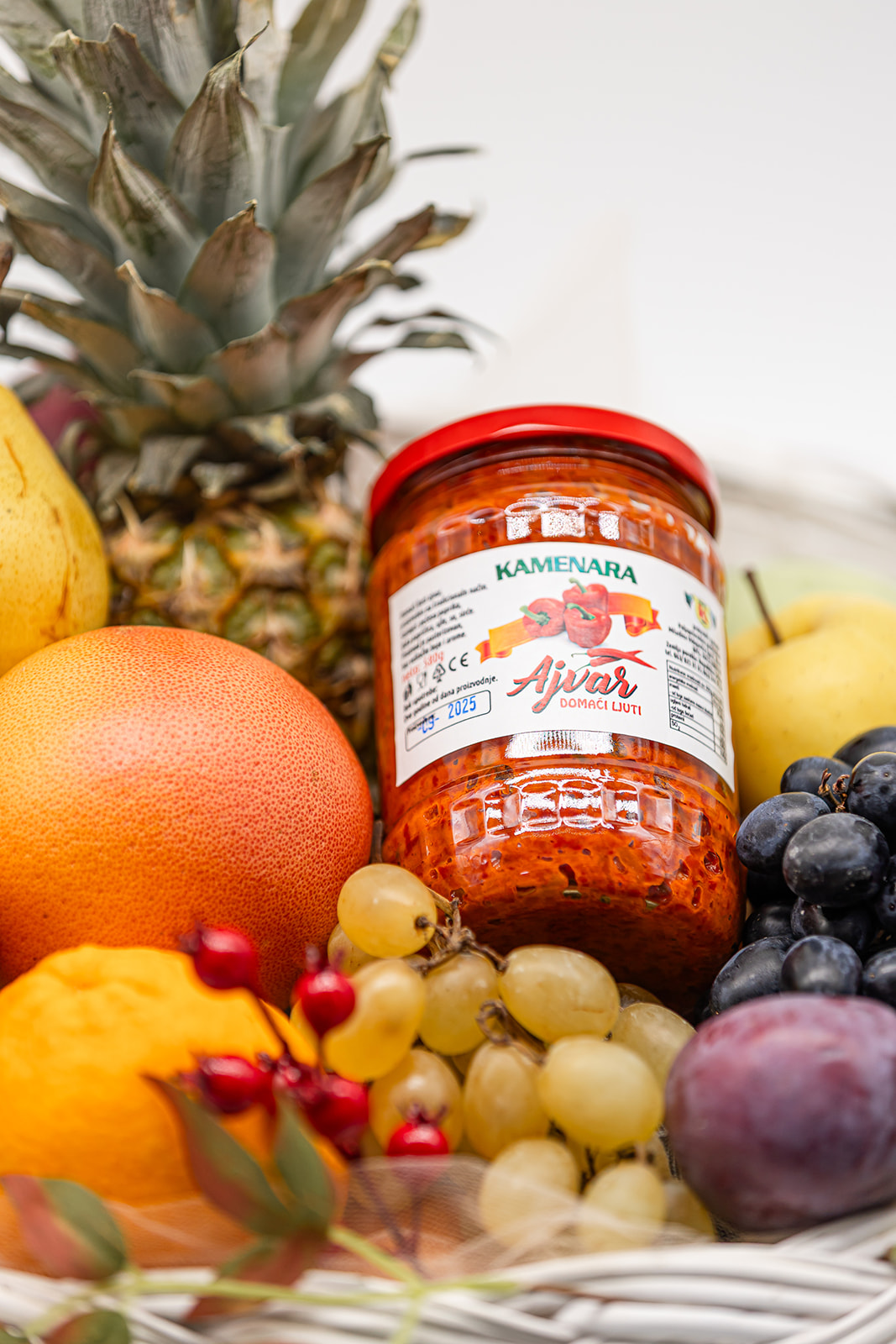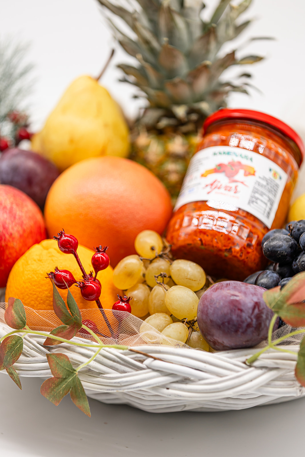 Korpa sa voćem i domaćim ajvarom može biti spakovana sa prazničnom dekoracijom ili u klasičnoj, elegantnoj varijanti.