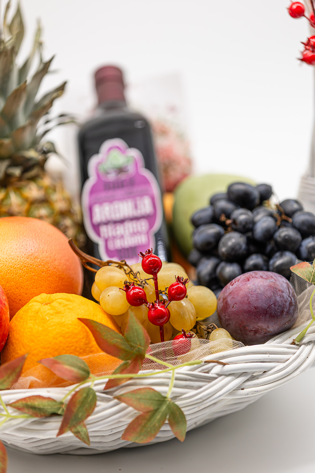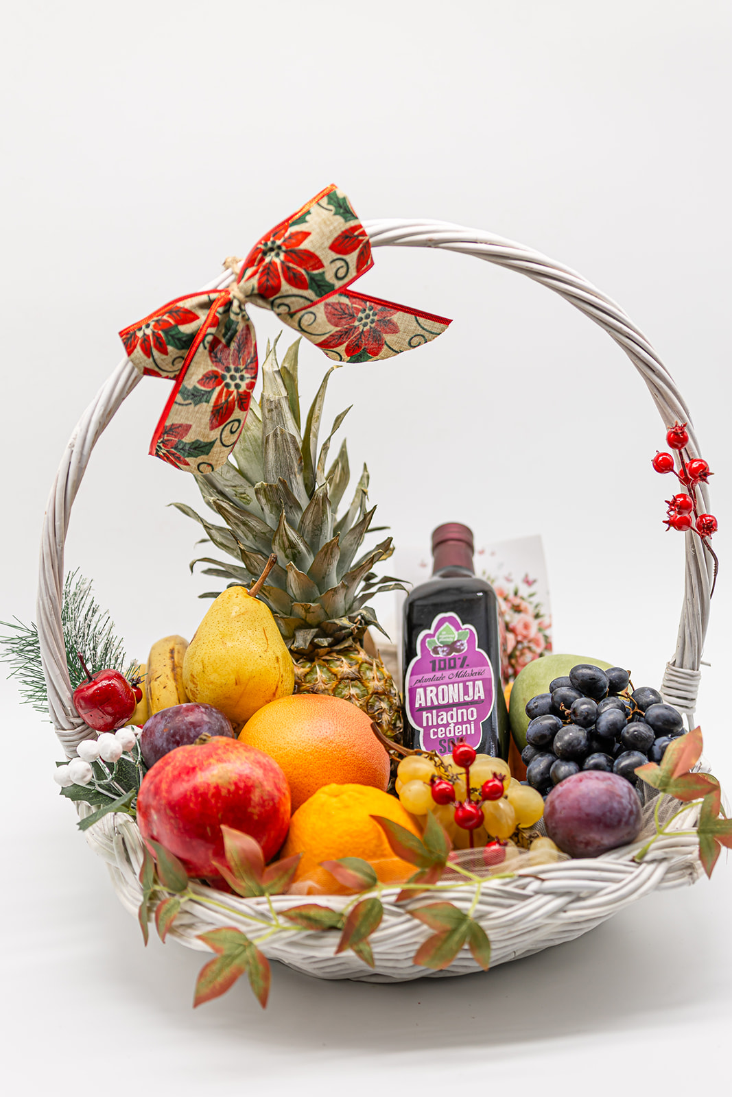 Korpa je od pruća, ručno pletena, a u njoj je spoj pažljivo biranog, svežeg i sočnog voća, poreklom sa domaćih plantaža. U korpi se pakuje ananas, nar, pomorandže, grejpfrut, crno i belo grožđe, kivi, jabuka, kruška, šljiva, banana i drugo voće. U korpi je hladno ceđeni sok od aronije bez šećera, bez konzervansa i veštačkih boja, pogodan za jačanje imuniteta i poboljšanje krvne slike.