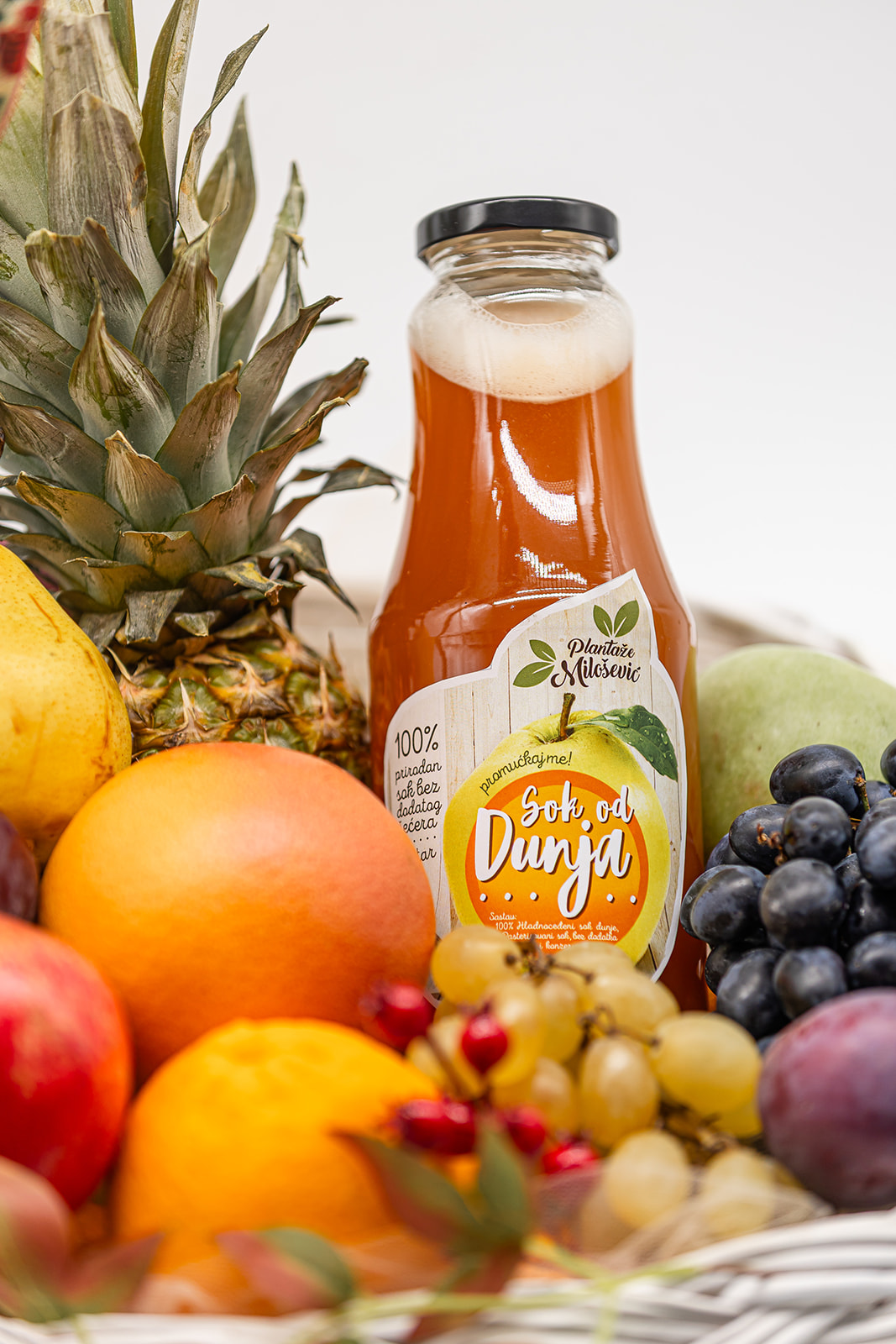 Korpa je od pruća, ručno pletena, a u njoj je spoj pažljivo biranog, svežeg i sočnog voća, poreklom sa domaćih plantaža. U korpi se pakuje ananas, nar, pomorandže, grejpfrut, crno i belo grožđe, kivi, jabuka, kruška, šljiva, banana i drugo voće. U korpi je hladno ceđeni sok od dunje bez šećera, bez konzervansa i veštačkih boja, pogodan za jačanje imuniteta i poboljšanje krvne slike.