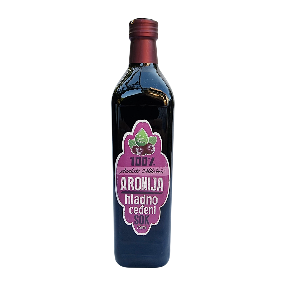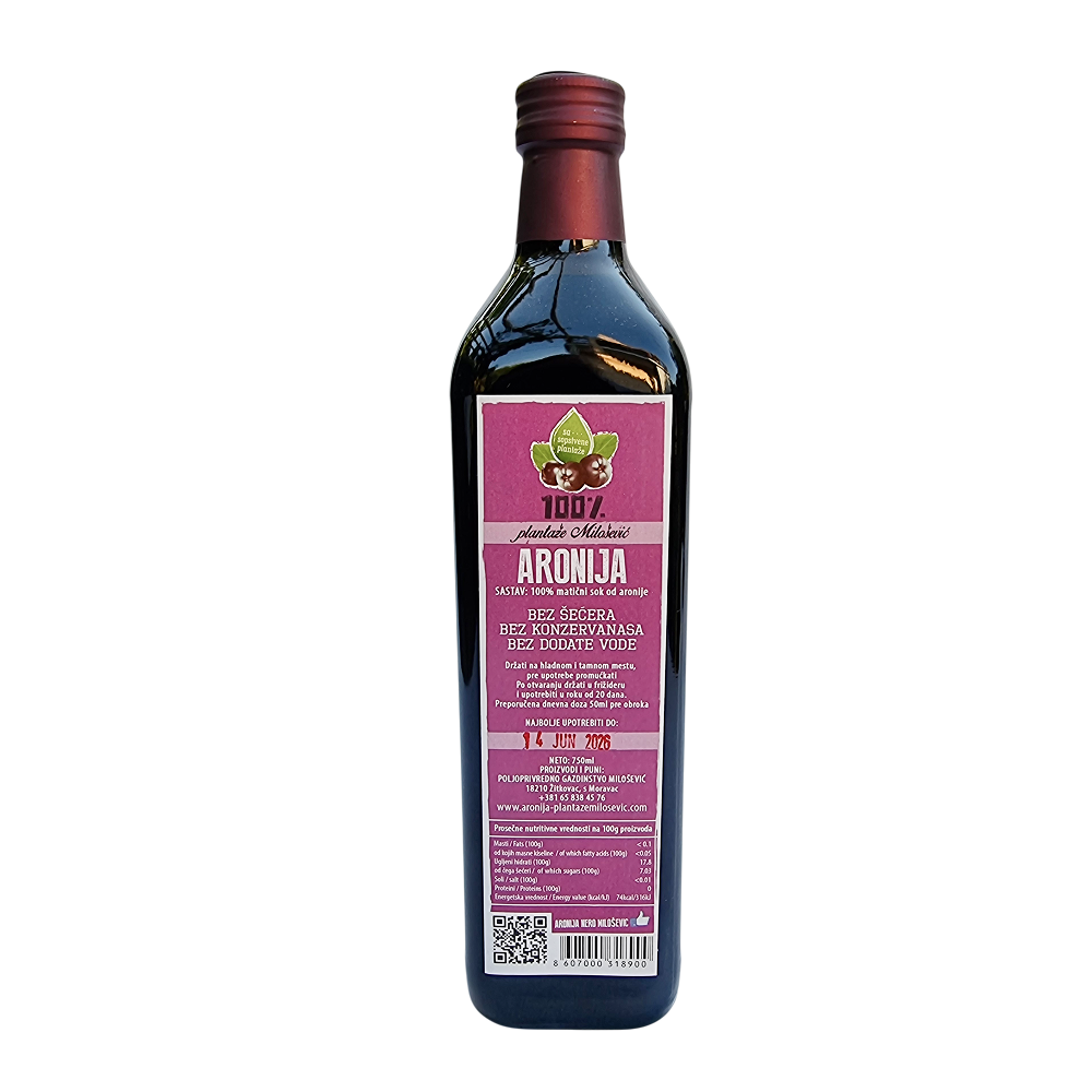 100% prirodan, hladno ceđeni matični sok od aronije. Bez dodatog šećera, vode, konzervansa, boja ili aroma.