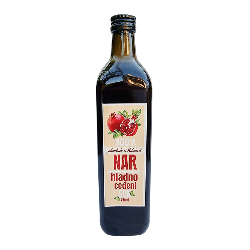 100% prirodan, hladno ceđeni pasterizovani sok od nara. Bez dodatog šećera, vode, konzervansa, boja ili aroma.